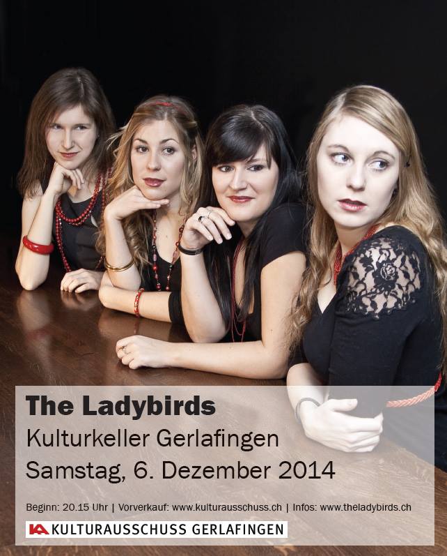 Im Rahmen der Veranstaltungsreihe «Kultur in der Kirche» sind The Ladybirds am Freitag 23. Mai 2014 in der Thomaskirche Biberist-Gerlafingen zu sehen und zu hören. Das Konzert beginnt um 20 Uhr (Türöffnung: 19.30 Uhr). Eintritt: 20 Franken, Vorverkauf: Drogerie Frey, Gerlafingen; Foto Grossen, Biberist Download Flyer (PDF)